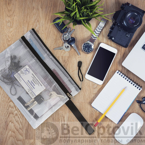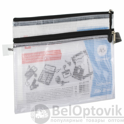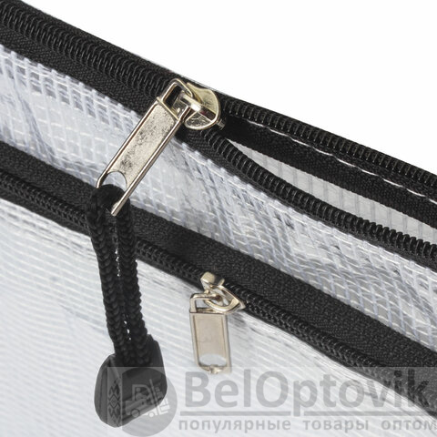 Изготовлена из прочного прозрачного пластика толщиной 0,3 мм с сетчатой фактурой и имеет 2 отделения. Формат А5 (238х180 мм). Герметичная застежка-молния защищает документы от механических повреждений, а также пыли и влаги. Цвет молнии - черный.