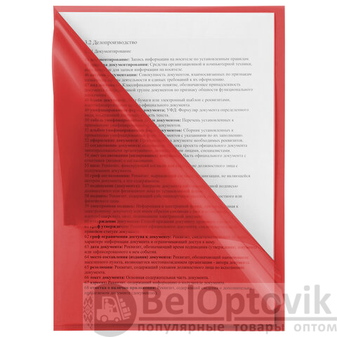 Папка формата А4 выполнена из высококачественного полипропилена плотностью 100 мкм. Она предотвращает смятие, загрязнение или намокание бумаг. Прозрачный материал позволяет определить содержимое, не открывая папку. Специальная выемка для перелистывания листов облегчает работу с документами. Данная папка заметно выделяется среди других благодаря яркому красному цвету.