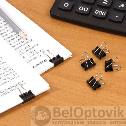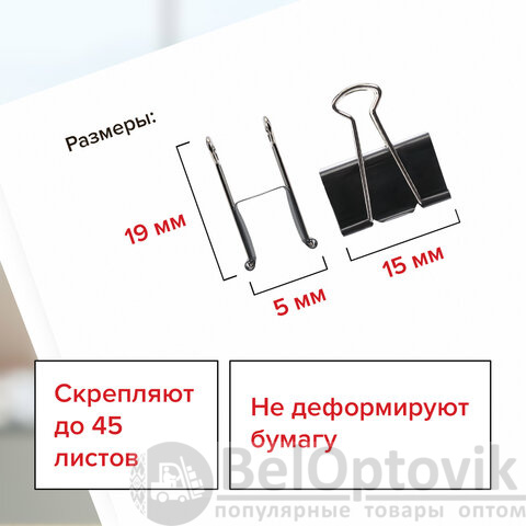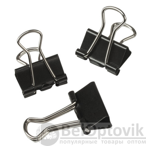 Изготовлены из стали с черным покрытием. Позволяют скреплять до 45 листов. Не деформируют бумагу. Ширина зажима - 15 мм. Поставляются по 12 штук в картонной коробке.