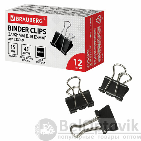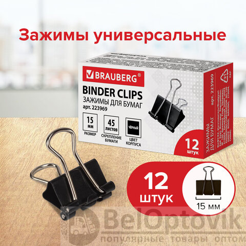 Зажимы для бумаг BRAUBERG, КОМПЛЕКТ 12 шт., 15 мм, на 45 листов, черные, картонная коробка, 223969