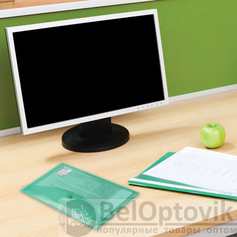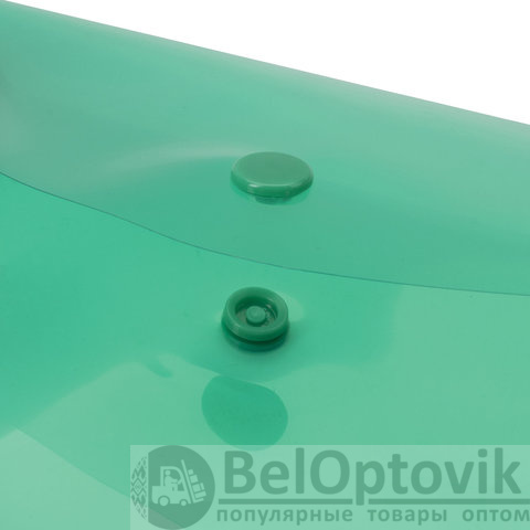 Папка-конверт с гладкой фактурой формата А5 изготовлена из плотного прозрачного пластика зеленого цвета толщиной 180 мкм. Закрывается на защелку-кнопку, что делает удобным частое использование и обеспечивает быстрый доступ к ее содержимому. Папка способна вместить до 100 листов стандартной плотности.
