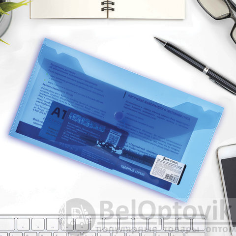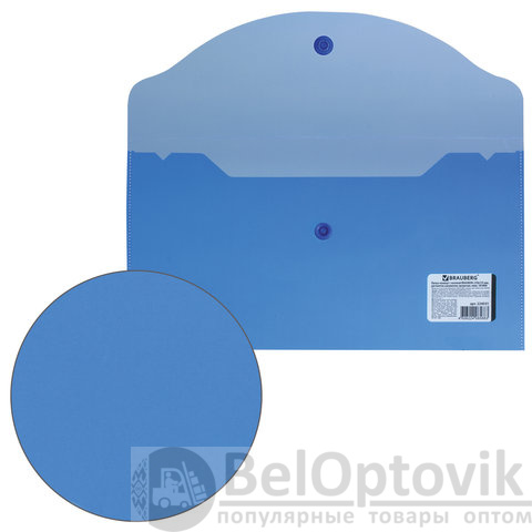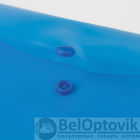 Папка-конверт с гладкой фактурой размера 250х135 мм изготовлена из плотного прозрачного пластика синего цвета толщиной 180 мкм. Закрывается на защелку-кнопку, что делает удобным частое использование и обеспечивает быстрый доступ к ее содержимому. Папка способна вместить до 100 листов стандартной плотности.
