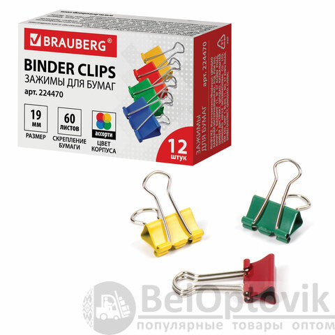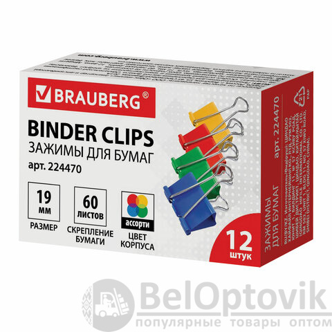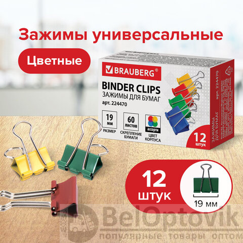 Зажимы для бумаг BRAUBERG, КОМПЛЕКТ 12 шт., 19 мм, на 60 листов, цветные, картонная коробка, 224470