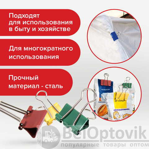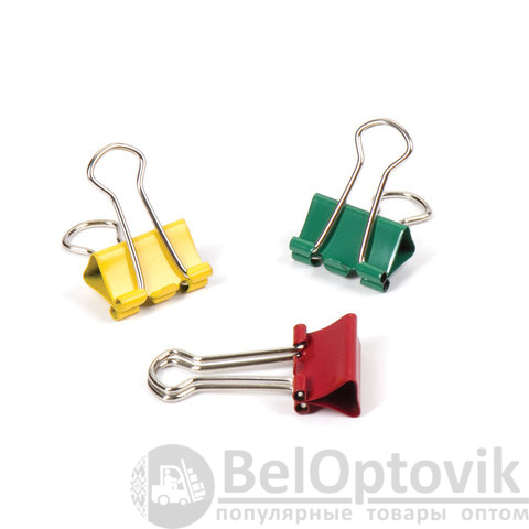 Изготовлены из стали с цветным покрытием. Позволяют скреплять до 60 листов. Не деформируют бумагу. Ширина зажима - 19 мм. Поставляются по 12 штук в картонной коробке.