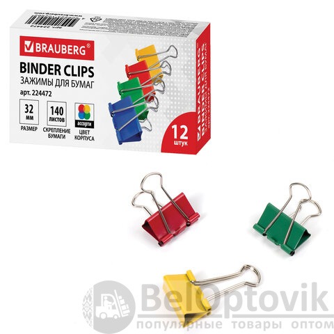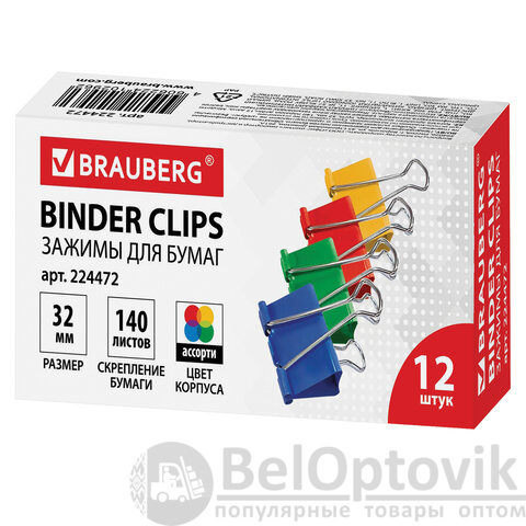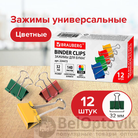 Зажимы для бумаг BRAUBERG, КОМПЛЕКТ 12 шт., 32 мм, на 140 листов, цветные, картонная коробка, 224472