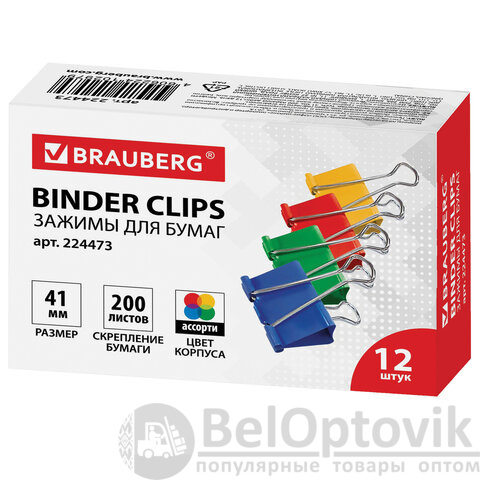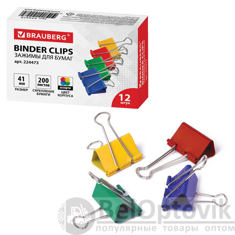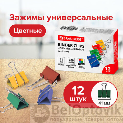 Зажимы для бумаг BRAUBERG, КОМПЛЕКТ 12 шт., 41 мм, на 200 листов, цветные, картонная коробка, 224473