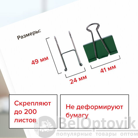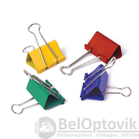 Изготовлены из стали с цветным покрытием. Позволяют скреплять до 200 листов. Не деформируют бумагу. Ширина зажима - 41 мм. Поставляются по 12 штук в картонной коробке.