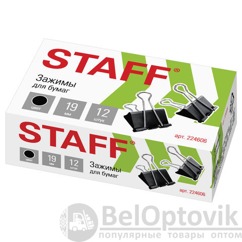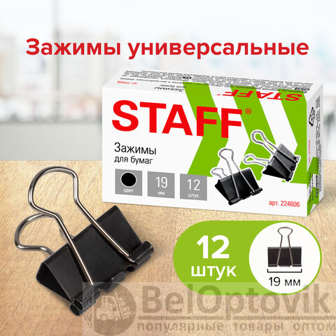 Зажимы для бумаг STAFF "EVERYDAY", КОМПЛЕКТ 12 шт., 19 мм, на 60 листов, черные, картонная коробка, 224606