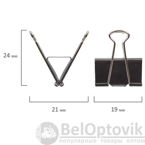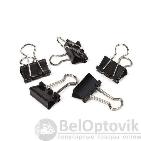 Изготовлены из стали с черным покрытием. Позволяют скреплять до 60 листов. Не деформируют бумагу. Ширина зажима - 19 мм. Поставляются по 12 штук в картонной коробке.