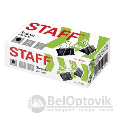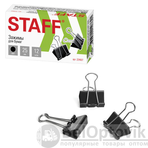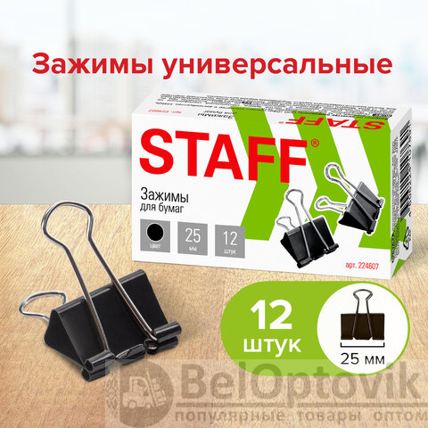 Зажимы для бумаг STAFF "EVERYDAY", КОМПЛЕКТ 12 шт., 25 мм, на 100 листов, черные, картонная коробка, 224607