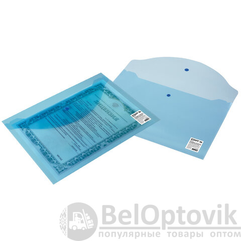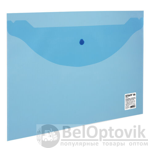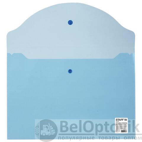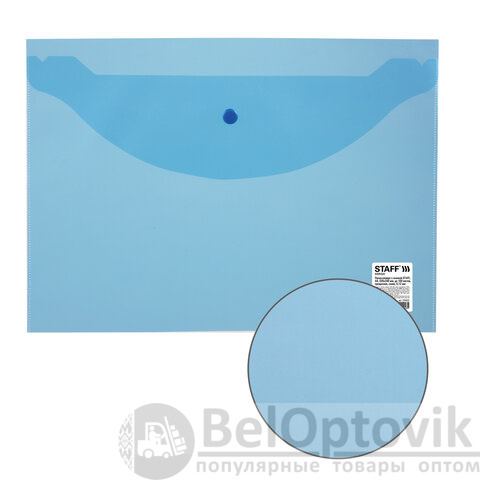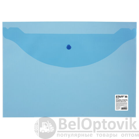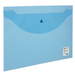 Папка-конверт с кнопкой STAFF, А4, до 100 листов, прозрачная, синяя, 0,12 мм, 224623