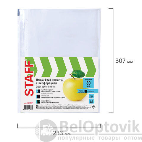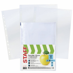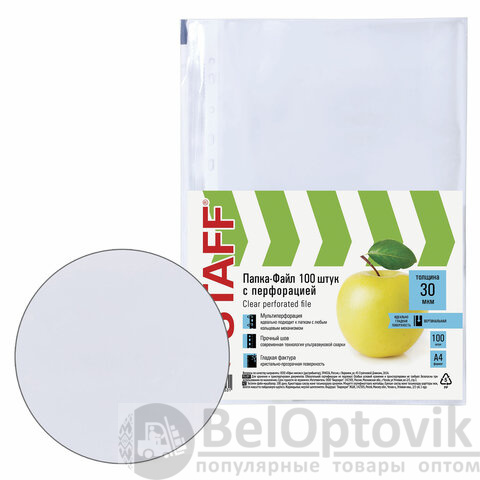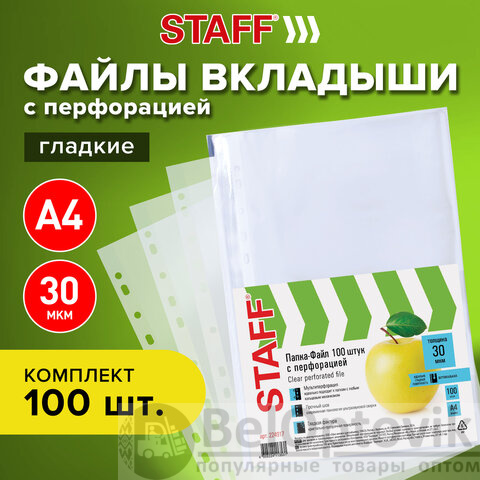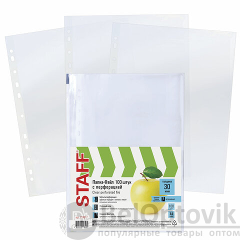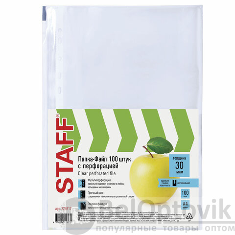 Папки-файлы перфорированные, А4, STAFF "STANDARD", КОМПЛЕКТ 100 шт., гладкие, "Яблоко", 30 мкм, 224917