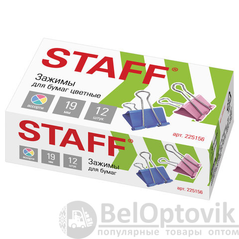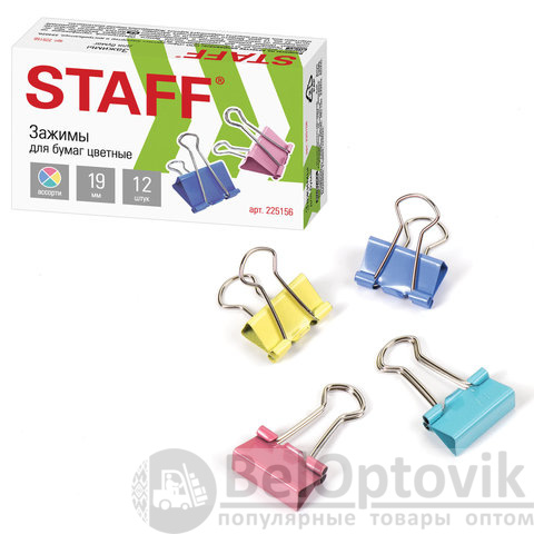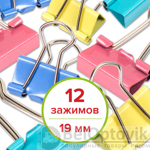 Зажимы для бумаг STAFF "Profit", КОМПЛЕКТ 12 шт., 19 мм, на 60 листов, цветные, картонная коробка, 225156