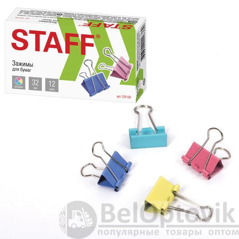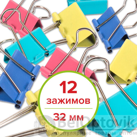 Зажимы для бумаг STAFF "Profit", КОМПЛЕКТ 12 шт., 32 мм, на 140 листов, цветные, картонная коробка, 225158