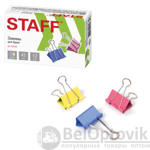 Зажимы для бумаг STAFF "Profit", КОМПЛЕКТ 12 шт., 41 мм, на 200 листов, цветные, картонная коробка, 225159