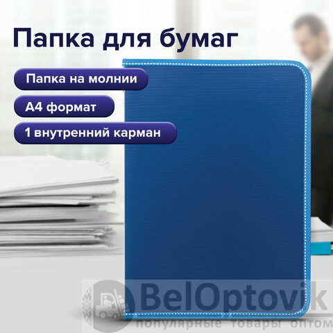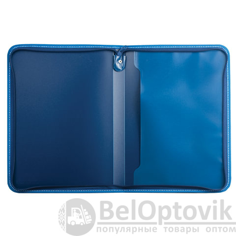 Изготовлена из прочного пластика толщиной 0,5 мм с горизонтальной фактурой. Формат А4 (335х242 мм). Надежный замок-молния защищает документы от механических повреждений, а также пыли и влаги. Цвет папки - синий с голубой молнией.