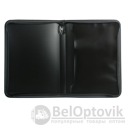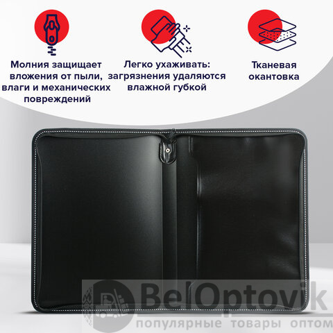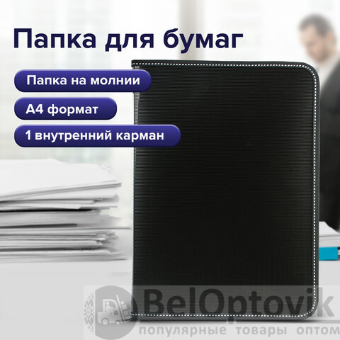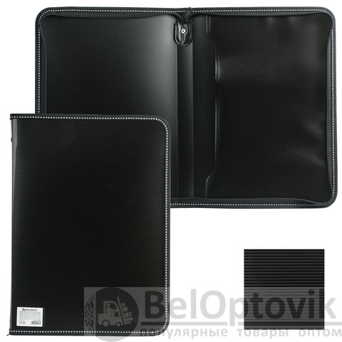 Изготовлена из прочного пластика толщиной 0,5 мм с горизонтальной фактурой. Формат А4 (335х242 мм). Надежный замок-молния защищает документы от механических повреждений, а также пыли и влаги. Цвет папки - черный.