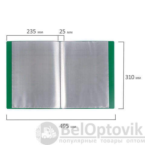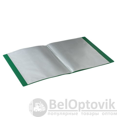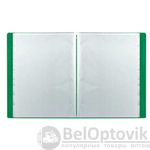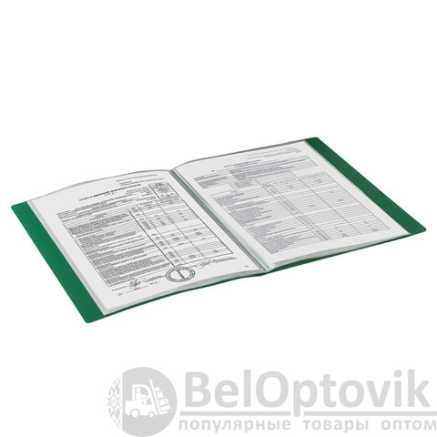 Для маркировки содержимого на корешок наклеена этикетка. Папка изготовлена из пластика толщиной 0,5 мм с антибликовой фактурой, а ширина корешка составляет 25 мм. Содержит 40 вкладышей, позволяющих хранить документы формата А4 и обеспечивающих их надежную защиту от попадания влаги, пыли и прочих повреждений.