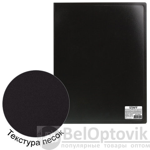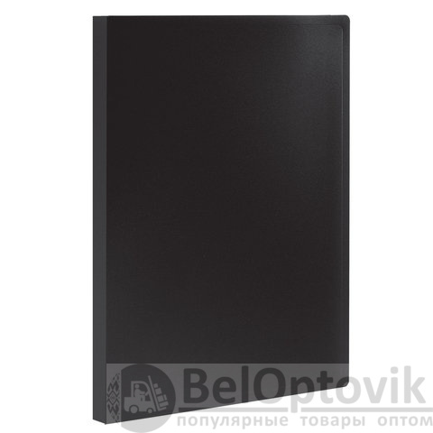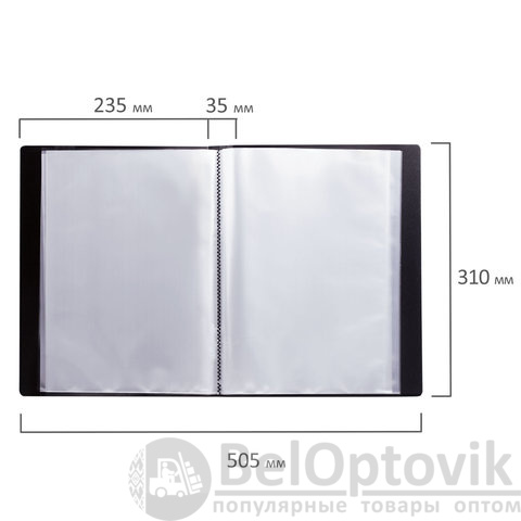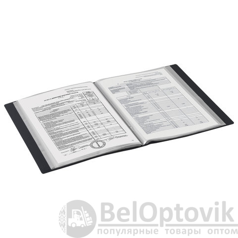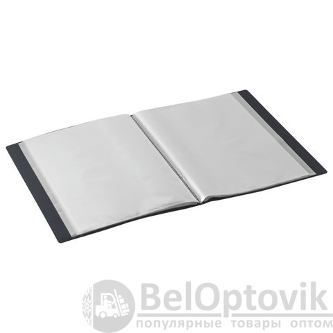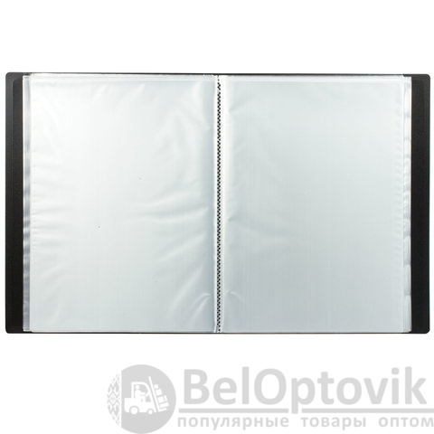Для маркировки содержимого на корешок наклеена этикетка. Папка изготовлена из пластика толщиной 0,5 мм с антибликовой фактурой, а ширина корешка составляет 35 мм. Содержит 60 вкладышей, позволяющих хранить документы формата А4 и обеспечивающих их надежную защиту от попадания влаги, пыли и прочих повреждений.