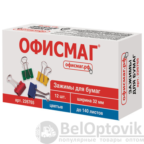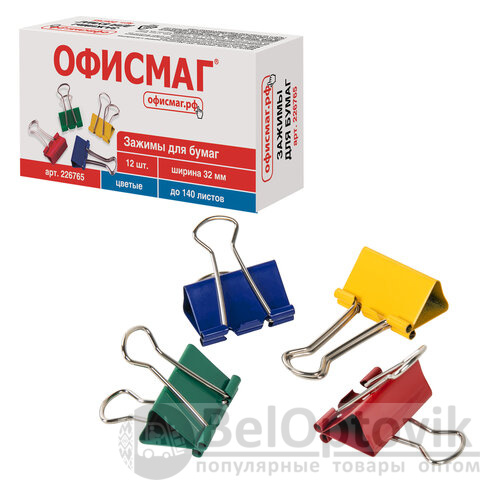 Зажимы для бумаг ОФИСМАГ, КОМПЛЕКТ 12 шт., 32 мм, на 140 листов, цветные, картонная коробка, 226765