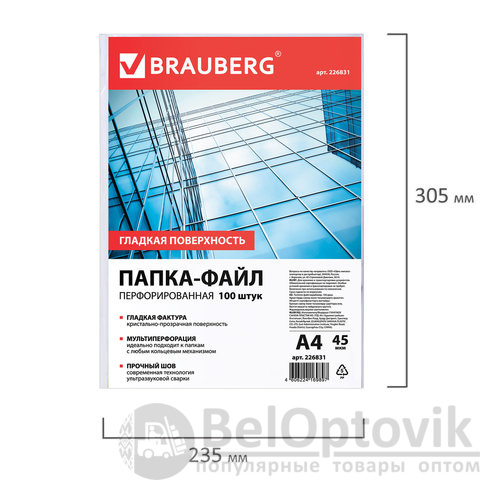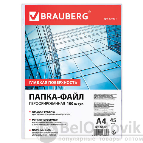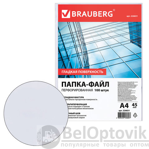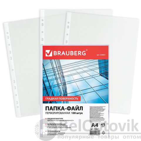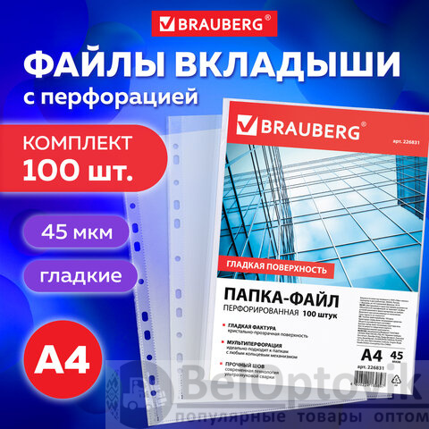Папки-файлы перфорированные, А4, BRAUBERG "STANDARD", комплект 100 шт., гладкие, 45 мкм, 226831
