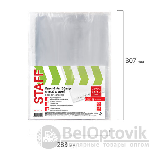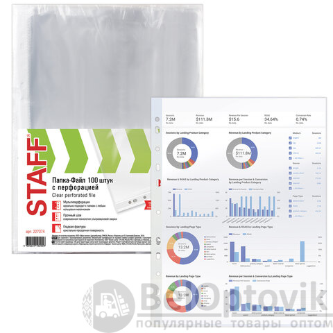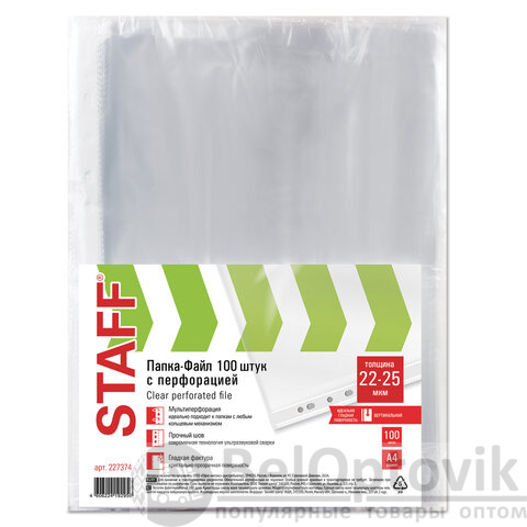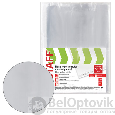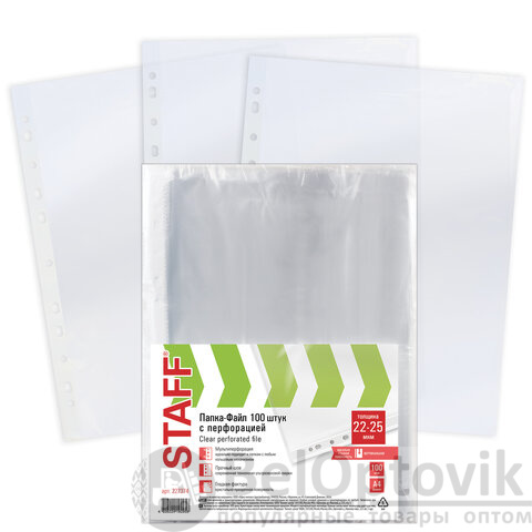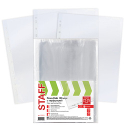 Папки-файлы перфорированные А4 STAFF "ЭКОНОМ", КОМПЛЕКТ 100 шт., гладкие, 22 - 25 мкм, 227374