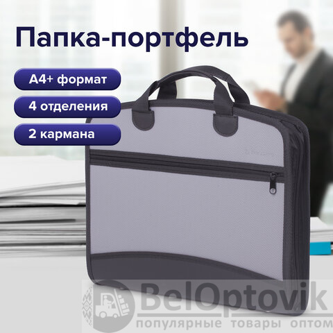 Папка-портфель пластиковая BRAUBERG А4+ (375х305х60 мм), 4 отделения, 2 кармана, серая, 228685