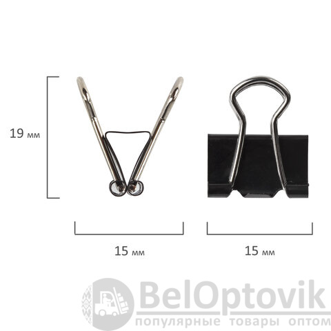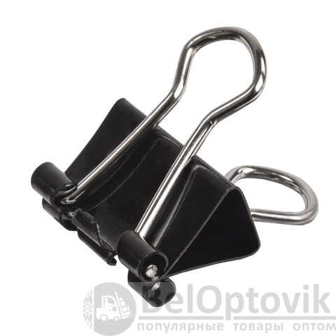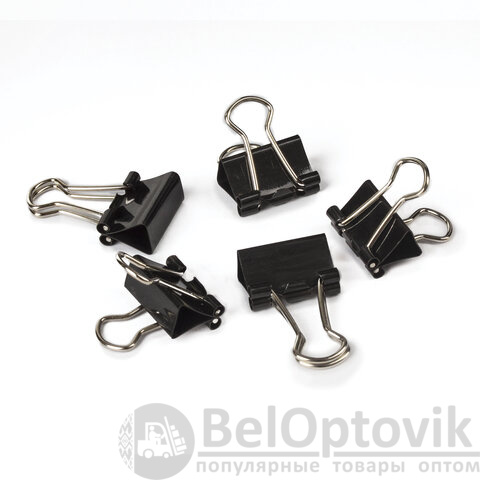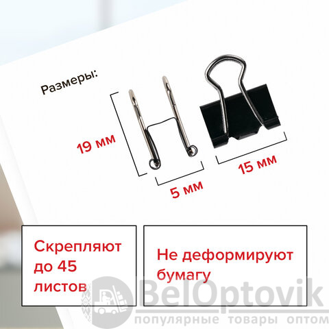 Изготовлены из стали с черным покрытием. Позволяют скреплять до 45 листов. Не деформируют бумагу. Ширина зажима - 15 мм. Поставляются по 12 штук в картонной коробке.