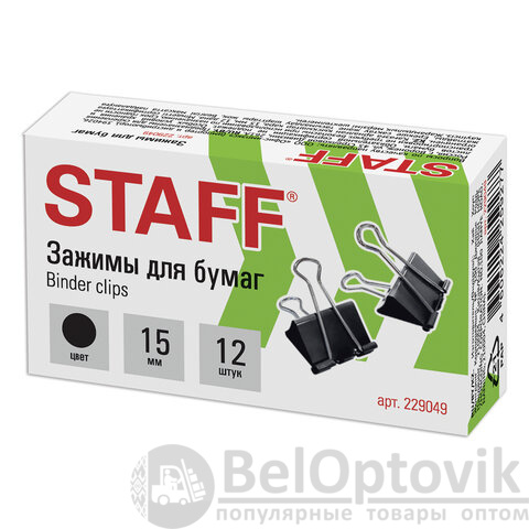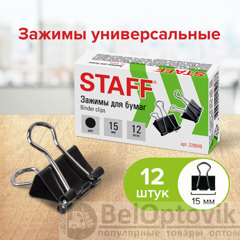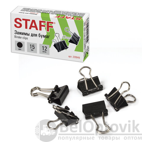 Зажимы для бумаг STAFF "EVERYDAY", КОМПЛЕКТ 12 шт., 15 мм, на 45 листов, черные, картонная коробка, 229049