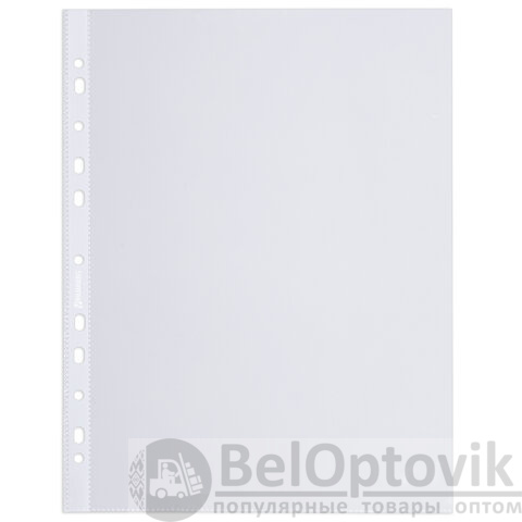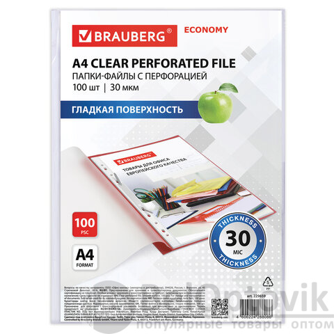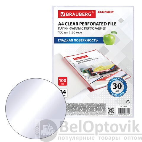 Перфопапки формата А4 с вертикальным размещением содержат универсальную перфорацию, а также имеют гладкую поверхность и прочные швы. Файлы являются незаменимым атрибутом в офисе, позволяют систематизировать документы и обеспечивают их сохранность на долгое время. Изготовлены из пленки толщиной 30 мкм. В комплект входит 100 перфопапок.