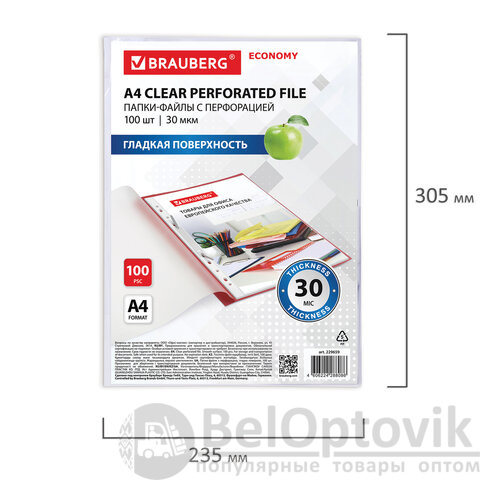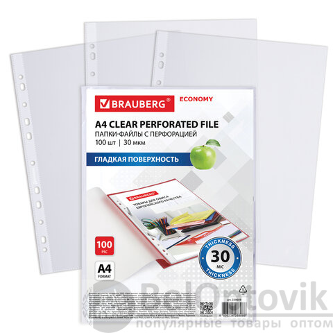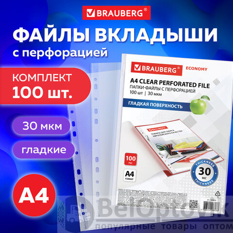 Папки-файлы перфорированные А4 BRAUBERG "ECONOMY", КОМПЛЕКТ 100 шт., гладкие, 30 мкм, 229659