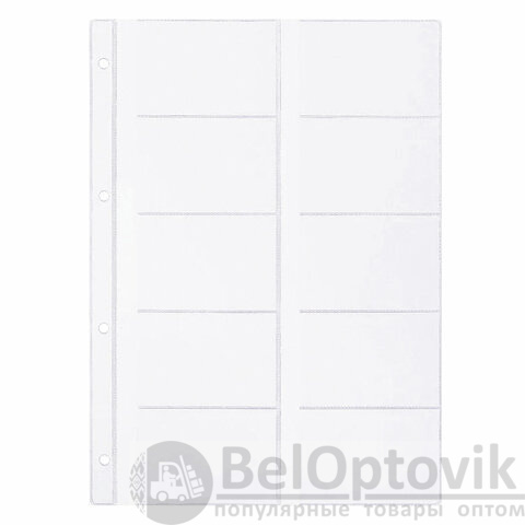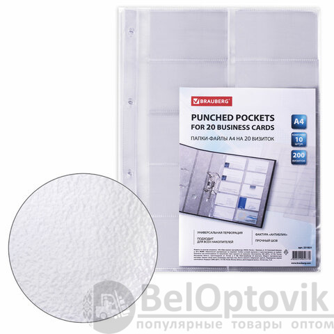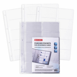 Перфопапки формата А4 изготовлены из прочного ПВХ плотностью 120 мкм. Имеют антибликовую фактуру. Специальная перфорация позволяет использовать файл для подшивки в папки с механизмом архивации на 2 или 4 кольцах, а также в скоросшиватель. Прочные швы карманов увеличивают срок службы изделия. 10 карманов рассчитаны на 20 визиток (в один кармашек можно вложить 2 визитки). Размер кармашков – 85х56 мм. В комплекте 10 листов.