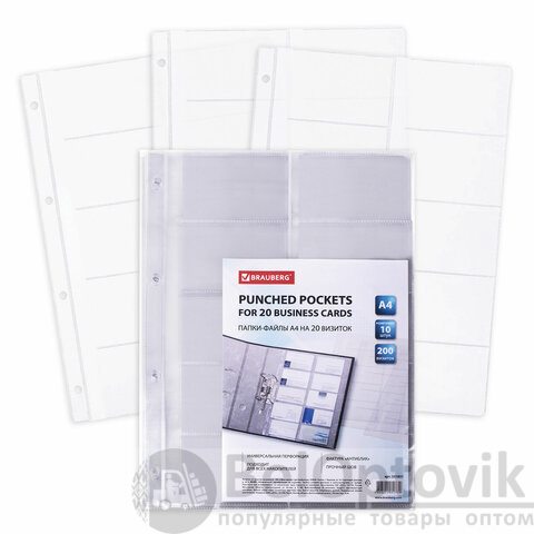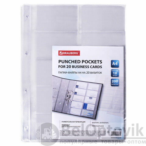 Папки-файлы на 20 визиток BRAUBERG, КОМПЛЕКТ 10 шт., А4 (210х297 мм), перфорированные, ПВХ 120 мкм, 231831