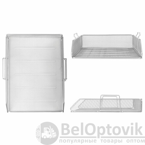 Изготовлен из высококачественной прочной металлической сетки. Выполнен в классическом серебристом цвете. Размер лотка - 77х260х337 мм. Упакован в индивидуальную коробку, на которой имеется схема сборки.