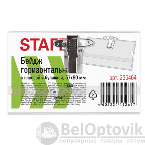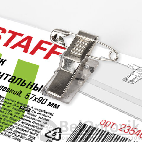 Бейдж горизонтальный (57х90 мм), с клипсой и булавкой, мягкий, STAFF "Basic", 235464