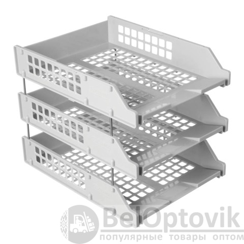 Лотки горизонтальные для бумаг, НАБОР 3 шт. (340х260х240 мм), на металлических стержнях, серые, "Strong", ЛТГ-63794