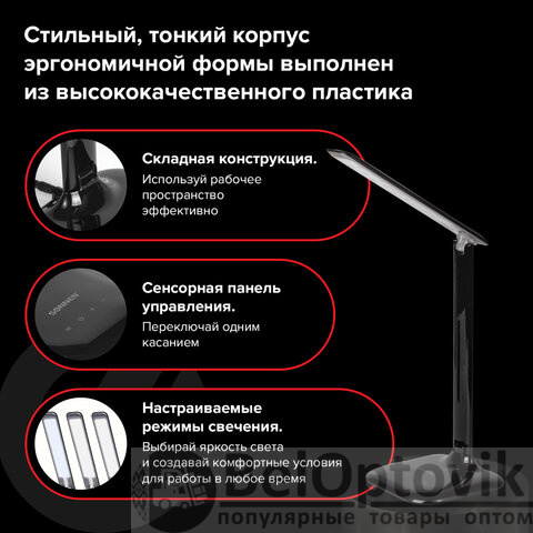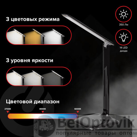 Настольный светильник высотой 33 см представлен в классическом черном дизайне, благодаря которому гармонично впишется в офисный или домашний интерьер. Устройство оснащено легким пластиковым корпусом и яркой LED матрицей на 8 Вт. Вы будете довольны освещением с цветовой температурой от 2700 до 6000 K и световым потоком 350 Лм, которое обеспечивают 14 светодиодов. Прибор оснащен сенсорным выключателем. Благодаря 3 режимам свечения можно самостоятельно выбрать яркость света.