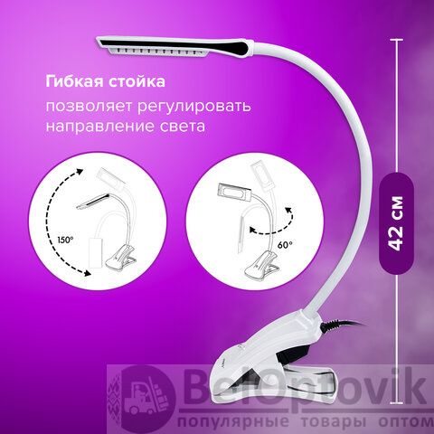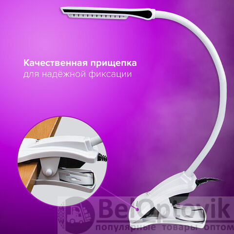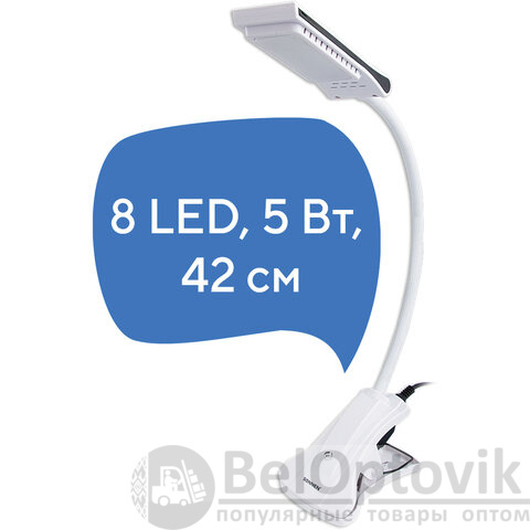 Настольный светильник высотой 42 см представлен в классическом белом дизайне, благодаря которому гармонично впишется в офисный или домашний интерьер. Устройство оснащено легким пластиковым корпусом на прищепке и яркой LED-матрицей на 5 Вт. Вы будете довольны освещением с цветовой температурой 6000 K и световым потоком 220 Лм, которое обеспечивают 8 светодиодов.