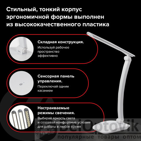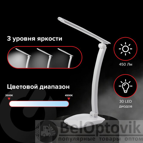 Настольный светильник высотой 42,3 см представлен в классическом белом дизайне, благодаря которому гармонично впишется в офисный или домашний интерьер. Устройство оснащено легким пластиковым корпусом и яркой LED-матрицей на 9 Вт. Вы будете довольны освещением с цветовой температурой 4500 K и световым потоком 450 Лм, которое обеспечивают 30 светодиодов. Прибор оснащен сенсорным выключателем. Благодаря 3 режимам свечения можно самостоятельно выбрать яркость света.
