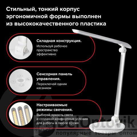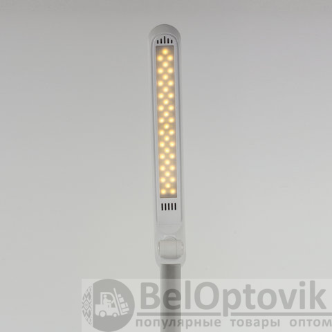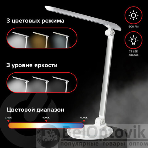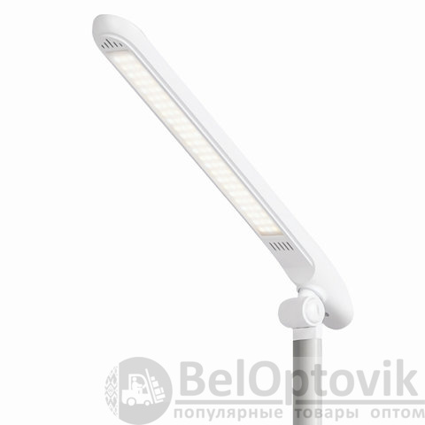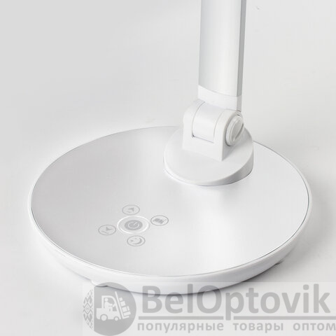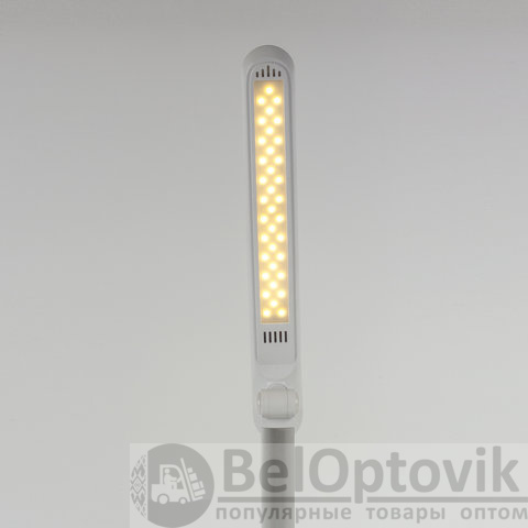 Настольный светильник высотой 44,5 см представлен в классическом белом дизайне, благодаря которому гармонично впишется в офисный или домашний интерьер. Устройство оснащено легким металлическим корпусом и яркой LED-матрицей на 10 Вт. Вы будете довольны освещением с цветовой температурой от 2700 до 6000 K и световым потоком 600 Лм, которое обеспечивают 72 светодиода. Прибор оснащен сенсорным выключателем. Благодаря 3 режимам свечения можно самостоятельно выбрать яркость света.