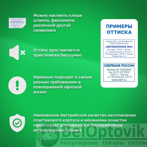 Неизменное высокое австрийское качество пластика и механизма оснастки гарантирует долговечное и бесперебойное использование штампа. Оттиск проставляется практически бесшумно, материал подушки обеспечивает полное, равномерное окрашивание оттиска.