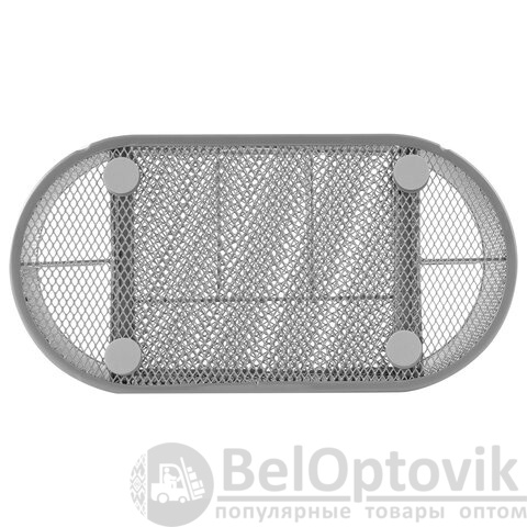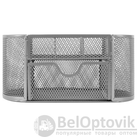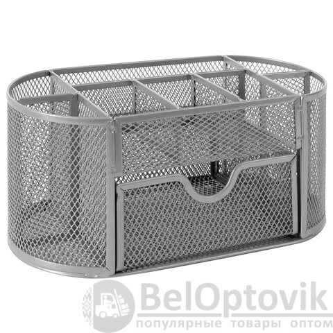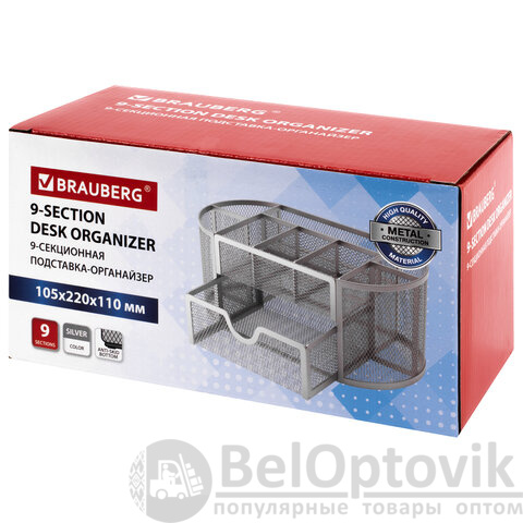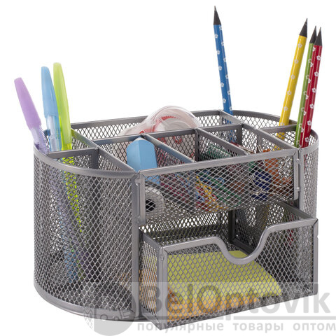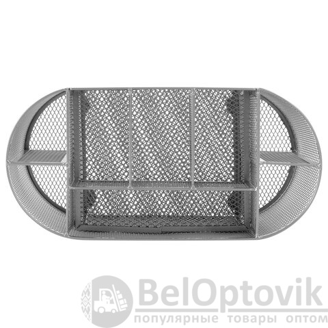 Изготовлена из металлической сетки. Имеет размеры 105х220х110 мм. Выполнена в серебристом цвете. Состоит из 9 секций, которые позволяют хранить и сортировать самые разные канцелярские принадлежности: от блоков для записей и кнопок – до ручек и текстовыделителей. Мягкие подушечки на дне предотвращают скольжение и порчу мебели. Поставляется без канцелярского наполнения.