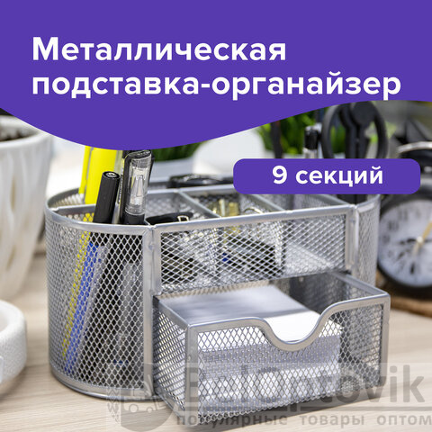 Подставка-органайзер металлическая BRAUBERG "Germanium", 9 секций, 105х220х110 мм, серебро, 237419