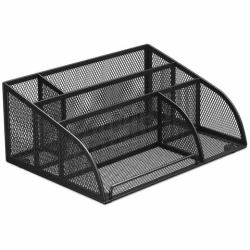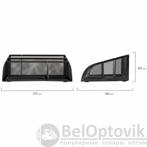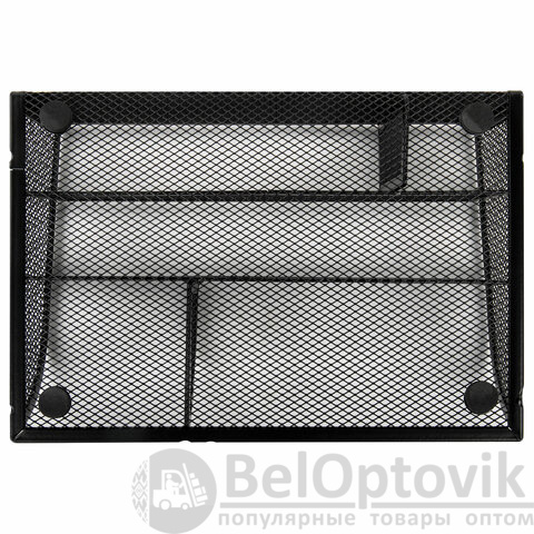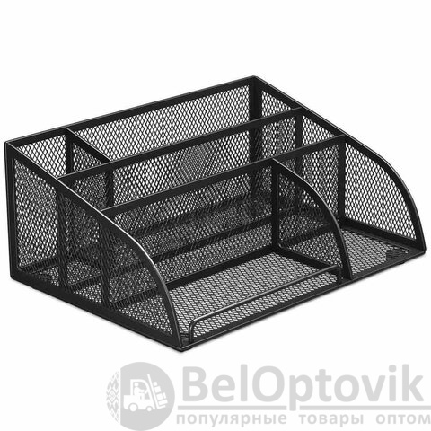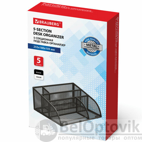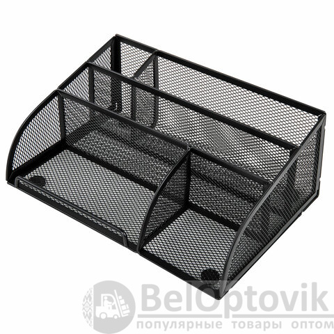 Изготовлена из металлической сетки. Имеет размеры 255х180х105 мм. Состоит из 5 отделений для пишущих принадлежностей и канцелярских мелочей. Мягкие подушечки на дне предотвращают скольжение и порчу мебели. Подставка-органайзер упакована в фирменную коробку. Поставляется без канцелярского наполнения.