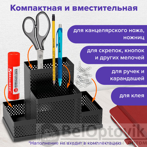 Практичная и долговечная металлическая подставка-органайзер BRAUBERG предназначена для хранения различных канцелярских и пишущих принадлежностей.