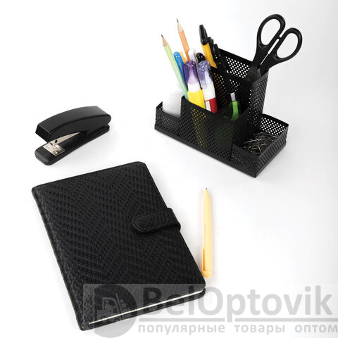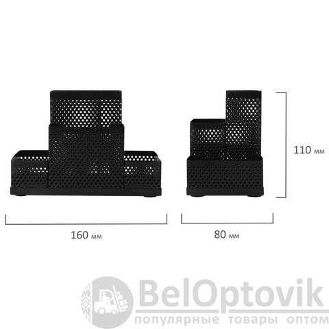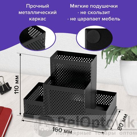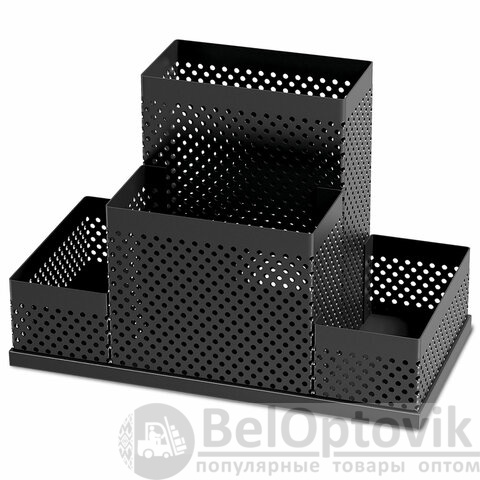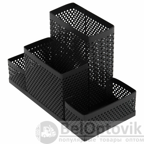 Изготовлена из металлической сетки. Имеет размеры 160х80х110 мм. Выполнена в черном цвете. Состоит из 4 секций, которые позволяют хранить и сортировать самые разные канцелярские принадлежности. Поставляется без канцелярского наполнения.