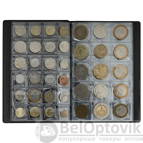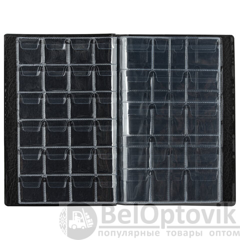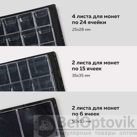 Альбом размером 125х185 мм выполнен из качественного ПВХ и представлен в черном цвете. Укомплектован 2-мя листами по 6 ячеек (размер ячеек 50х53 мм), 2-мя листами по 15 ячеек (размер ячеек 35х35 мм), 4-мя листами по 24 ячейки (размер ячеек 25х28 мм). Материал листов - ПВХ. Альбом вмещает 138 монет.