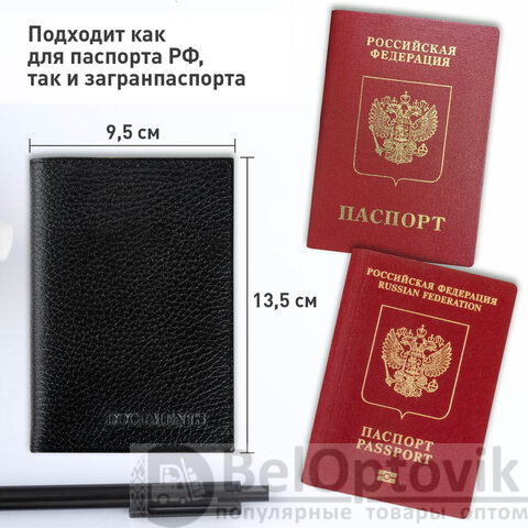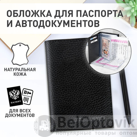 Обложка для автодокументов и паспорта натуральная кожа флоттер, "DOCUMENTS", черная, BRAUBERG 238193