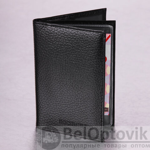 Модель выполнена из натуральной кожи в чёрном цвете с тиснением "Documents". Вмещает в себя обложку для паспорта из натуральной кожи и 6 пластиковых карманов для автодокументов: 1 файл для водительского удостоверения (60х89 мм), 4 файла размером 80х120 мм (подходят для СТС) и 1 файл для страхового полиса или доверенности формата А5 (150х216 мм) - документ формата А5 подразумевает его складывание пополам лицевой стороной наружу. Дополнительно присутствует карман для пластиковой карты.