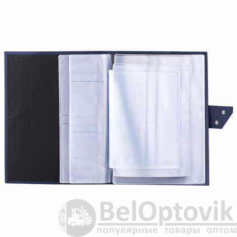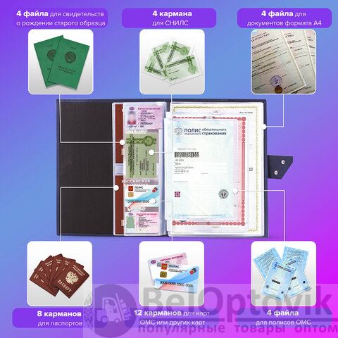 Папка-органайзер для семейных документов с плотной обложкой, включает в себя: 4 файла для документов формата А4, 4 файла для свидетельств о рождении старого образца, 4 файла для полисов ОМС, 4 кармана для СНИЛС, 8 карманов для паспортов, 12 карманов для карт ОМС или других карт. Обложка папки выполнена из экокожи синего цвета, матовые вкладыши изготовлены из прочного ПВХ-материала.